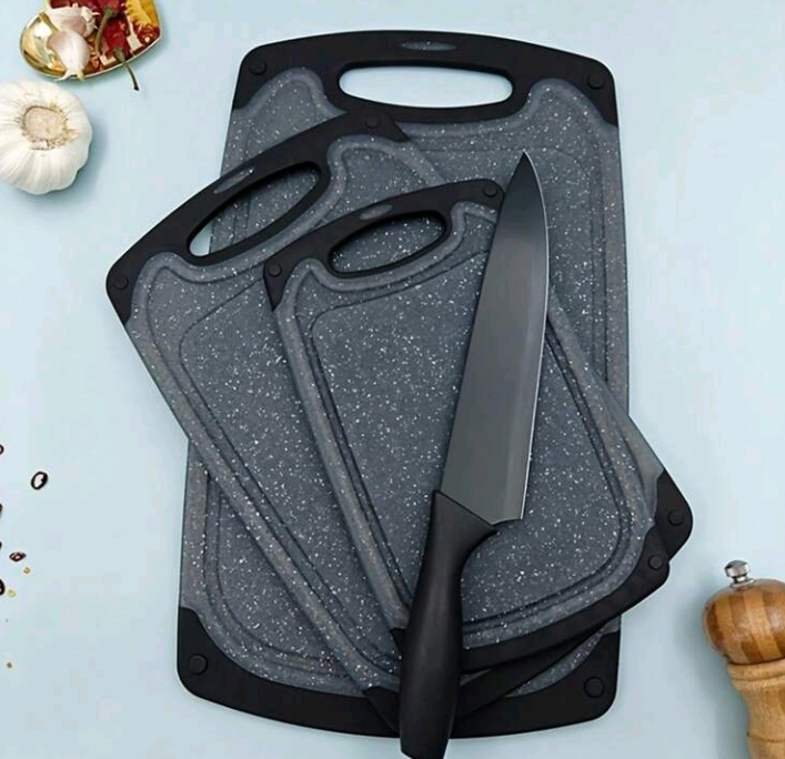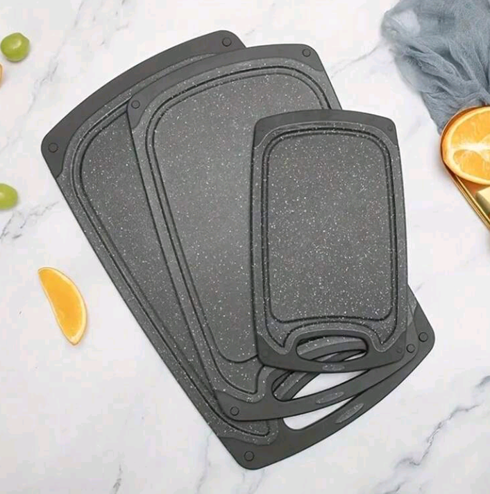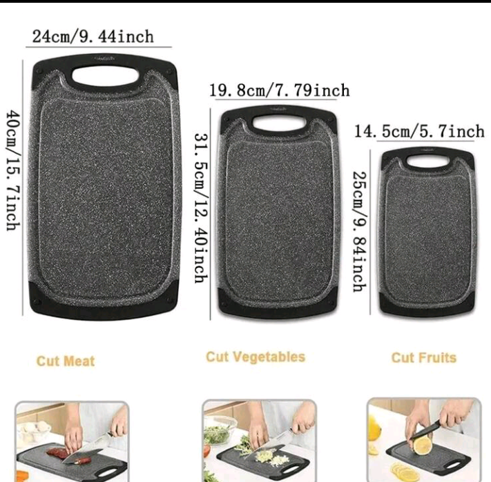 This 3pcs Plastic Chopping Board Set is made from durable, BPA-free, food-grade plastic that ensures safety, hygiene, and long-lasting use. The set includes three different board sizes designed to handle all your kitchen prep needs—from slicing fruits and vegetables to cutting meat and cheese. Each board features a non-slip edge, juice groove to prevent mess, and easy-grip handles for convenience. The boards are lightweight, dishwasher-safe, andUpgrade your kitchen essentials with this 3pcs Plastic Cutting Board Set, perfect for all kinds of food preparation. Whether you're chopping vegetables, slicing meat, or serving cheese, these sturdy boards offer a smooth, knife-friendly surface that keeps your blades sharp and your counters clean. Designed for home cooks and culinary enthusiasts, each board is lightweight, easy to clean, and space-saving, making it a versatile addition to any kitchen. The non-slip design and drip grooves ensure safety and cleanliness during food prep. Ideal as a gift for family or new homeowners, this set blends functionality with modern design. odor-resistant, making them perfect for daily cooking. Ideal for home kitchens, dorms, and food prep areas, these chopping boards combine practicality and style, offering a clean and efficient cutting experience.