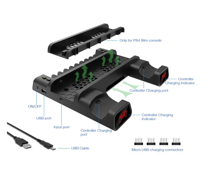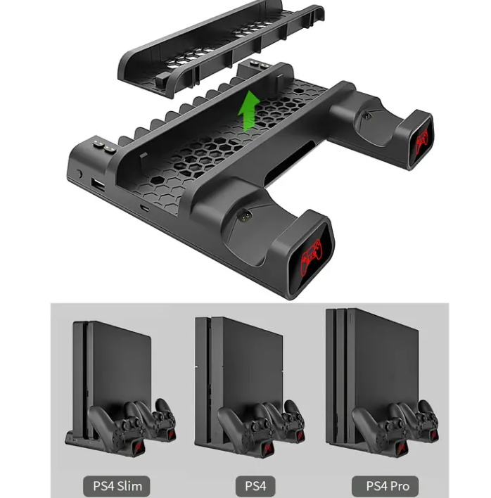 The ARIKROII PS4 Cooling Station is a multifunctional gaming accessory designed for PS4 Slim, PS4, and PS4 Pro consoles. Made from premium ABS material, it features a dual controller charging dock with fast USB-C charging ports, an efficient cooling system to prevent overheating, and a built-in LED indicator that shows charging status. The vertical stand design saves space while holding up to 10 game discs securely. Its anti-slip base provides stability during gameplay or charging. With optimized airflow and intelligent charging control, this station enhances console performance and extends its lifespan, making it an essential addition to any modern gaming setup.