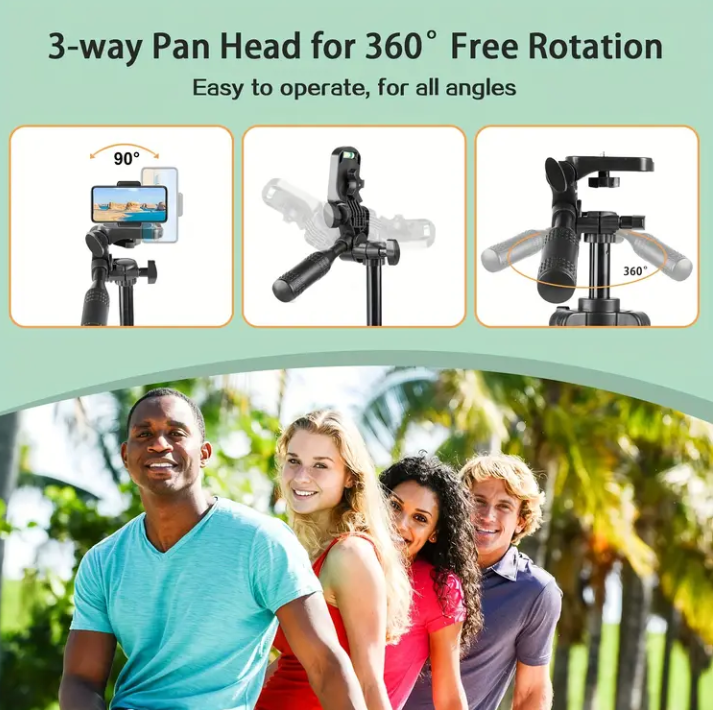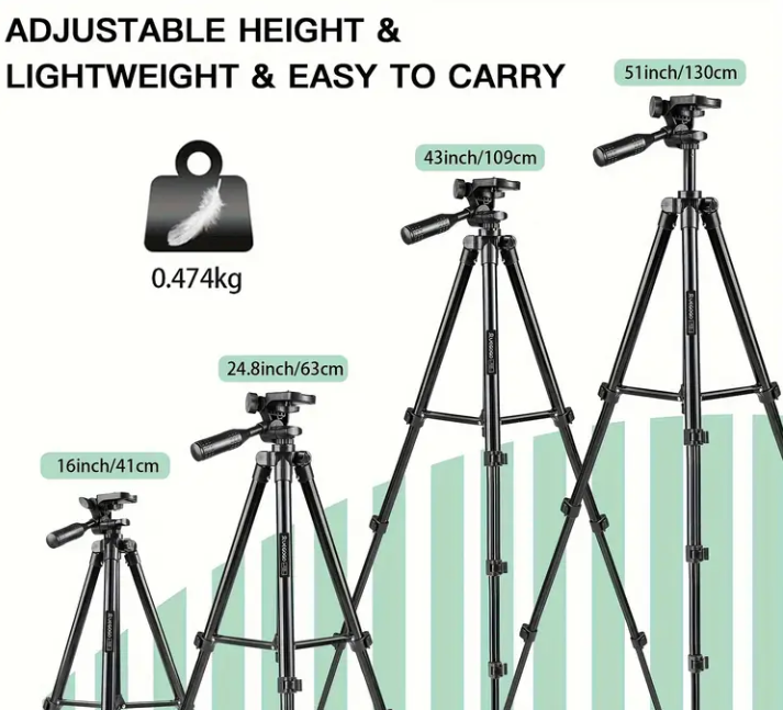 The UEGOGO Aluminum Tripod is a lightweight yet durable 129.54cm stand designed for stability and ease of use. Crafted from high-quality aluminum alloy, it ensures long-lasting performance while remaining portable for travel and outdoor shoots. The integrated gimbal head provides smooth 360° rotation and tilt control, perfect for capturing steady videos and photos. It is compatible with smartphones and tablets and includes an adjustable phone clip and carry bag for added convenience. No batteries are required for operation, making it a reliable choice for vlogging, selfies, live streaming, and video recording both indoors and outdoors.