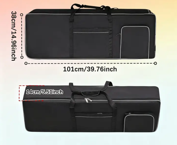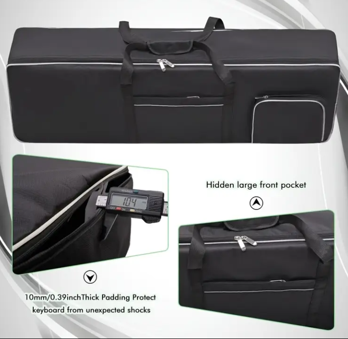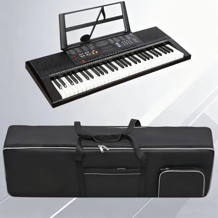 The Professional-Grade 61-Key Electronic Keyboard Case is designed to protect and transport your keyboard with maximum safety and style. Crafted from heavy-duty water-resistant fabric, it features a soft, scratch-resistant interior lining that cushions the instrument from impact and dust. The large accessory compartment provides space for cables, adapters, and sheet music, while the adjustable padded shoulder strap and reinforced handles ensure comfortable carrying during travel or performances. Compatible with most 61-key electronic keyboards, this durable case offers a sleek, professional look perfect for musicians, teachers, and performers who prioritize convenience, protection, and lasting quality in every use.