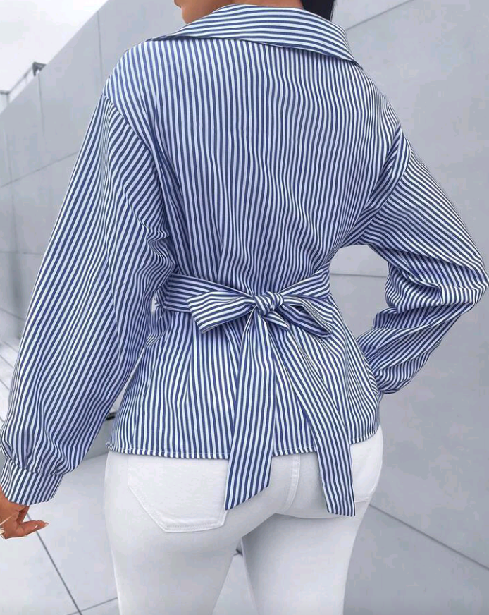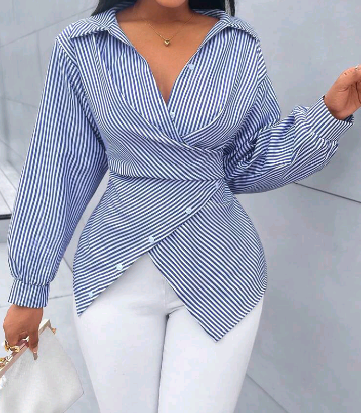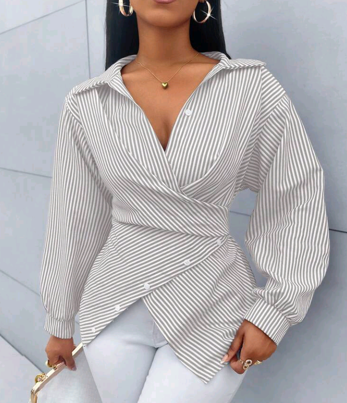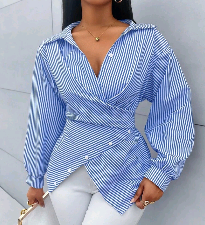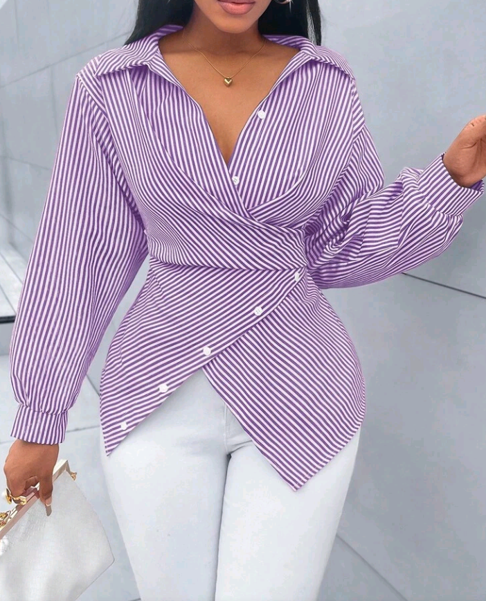 SOLERSUN Womenβs Striped Print Button-Front Asymmetrical Hem Batwing Sleeve Wrap Blouse