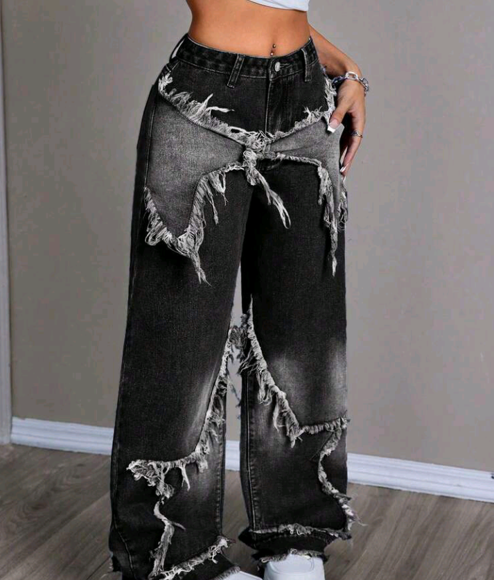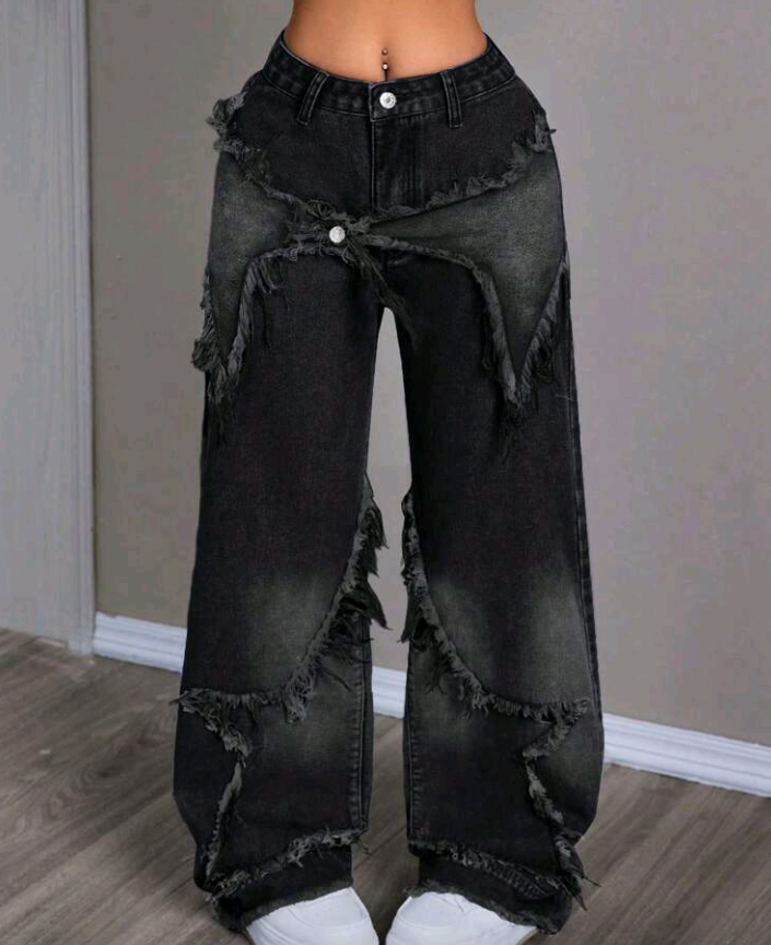 EZwear Fashionable Contrast Color Fringed Stars Patch Denim Jeans