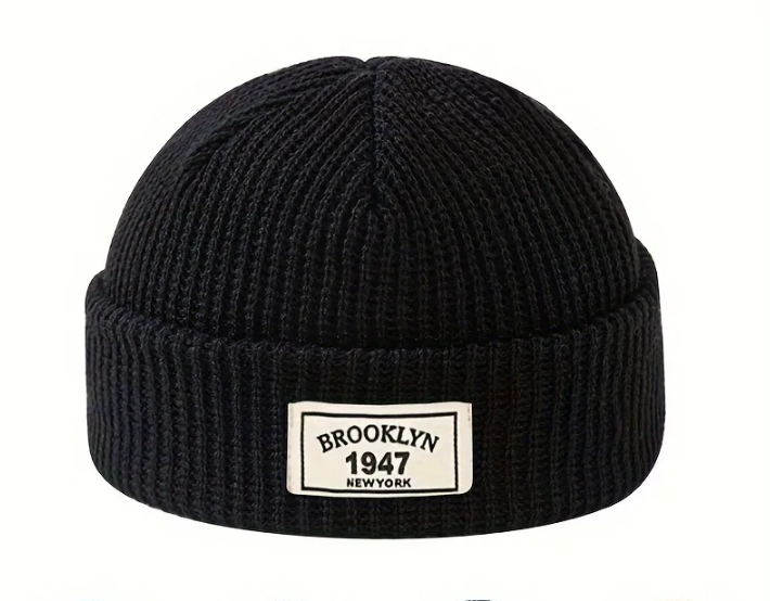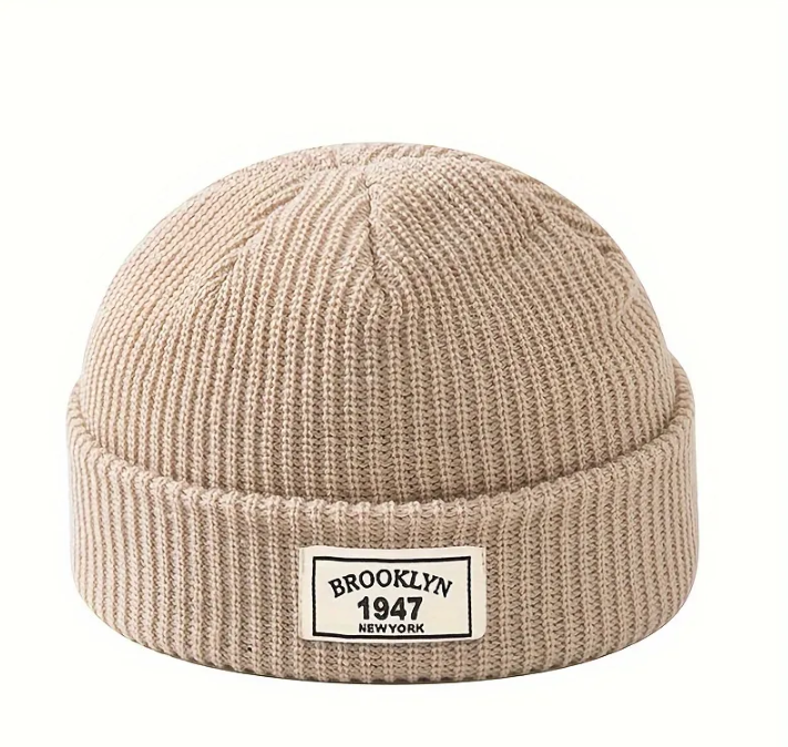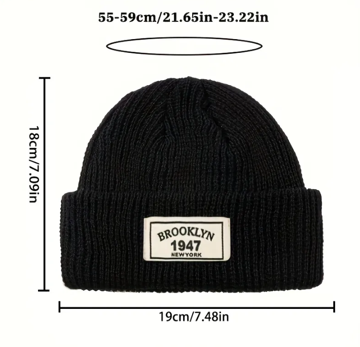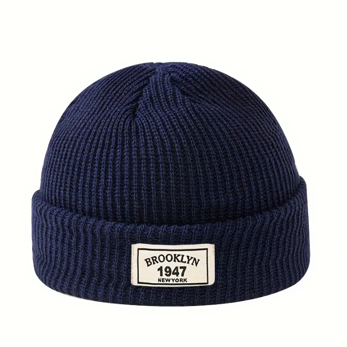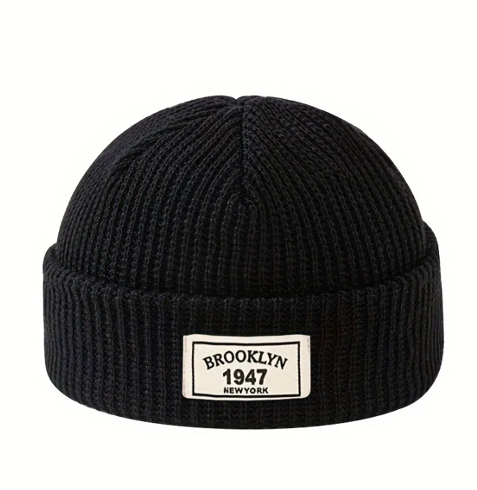 Men's Fashion Knitted Beanie β Warm Elastic Acrylic Winter Hat with Letter Patch
