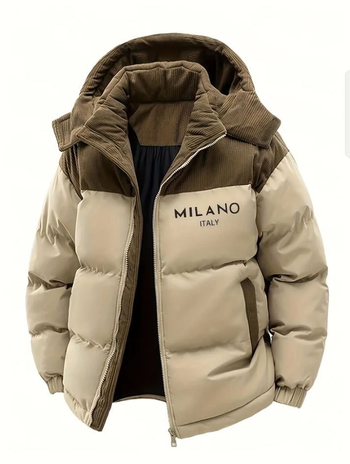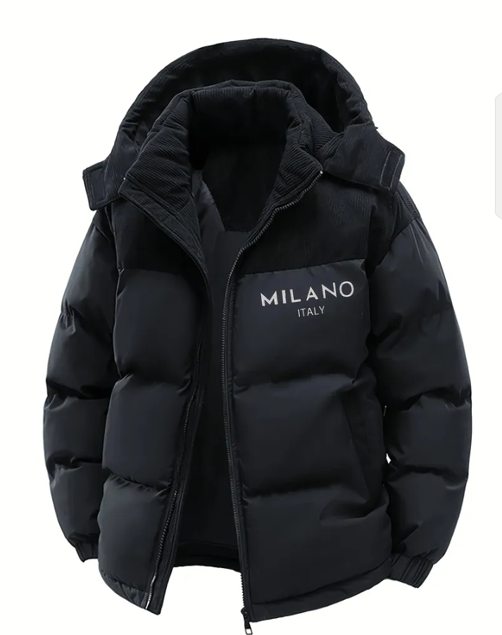 Men’s Casual Faux Fur Hooded Jacket with “MILANO ITALIA” Print – Lightweight Outdoor Coat with Pockets