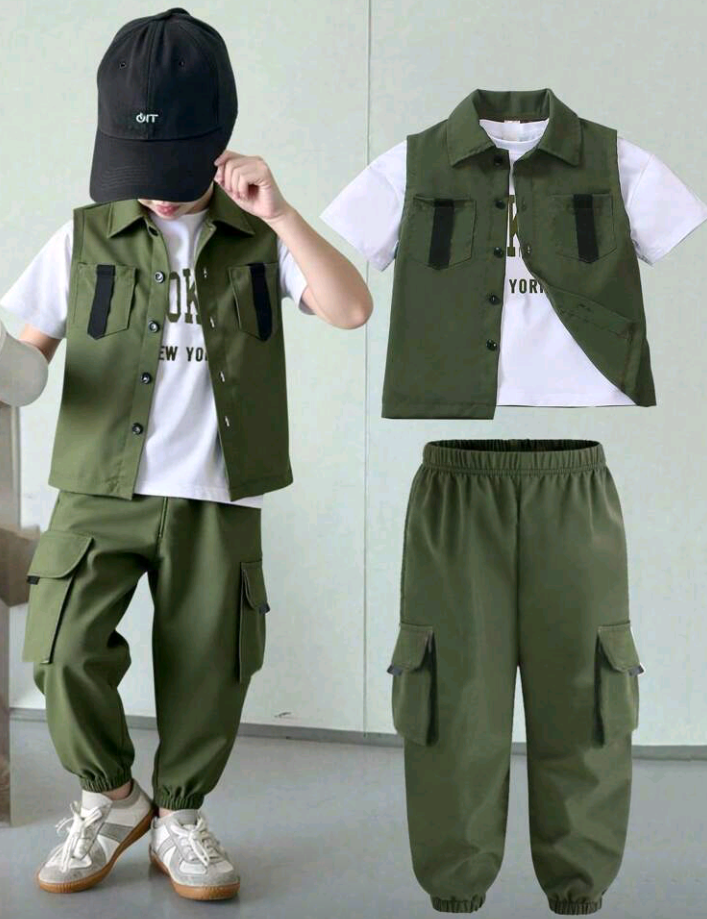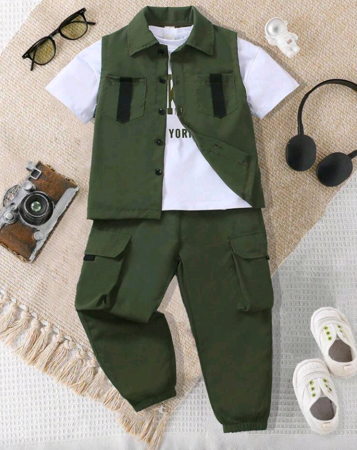 Explorewe Young Boy Fashion Cargo Pocket Vest Matched With Letter Print Short Sleeve Tee And Casual Cargo Pants β Cool Summer School & Outdoor Outfit