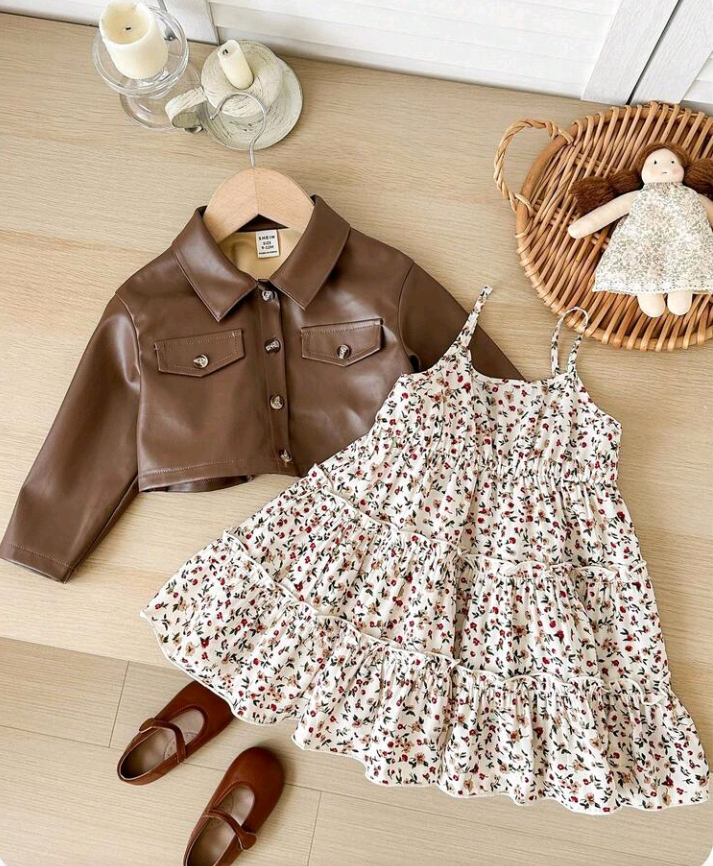Sleeveless Floral Print Dress With Brown Collar Outerwear For Baby Girls β Vintage Fall/Winter Toddler Outfit