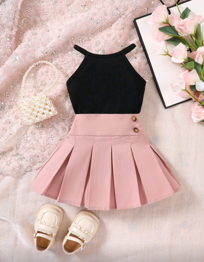 Baby Girl Halter Neck Top And Pleated Skirt 2-Piece Set