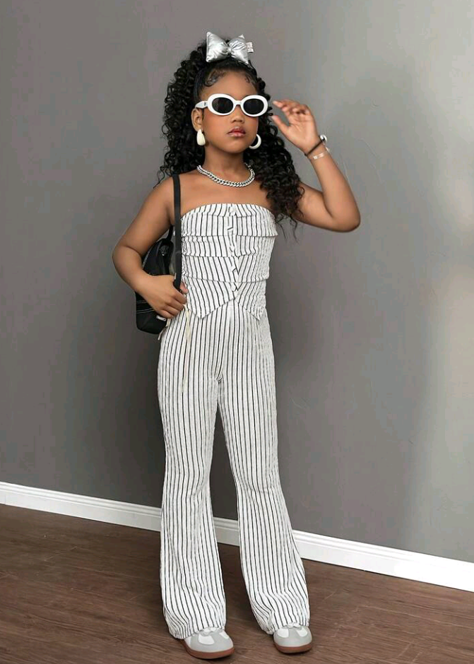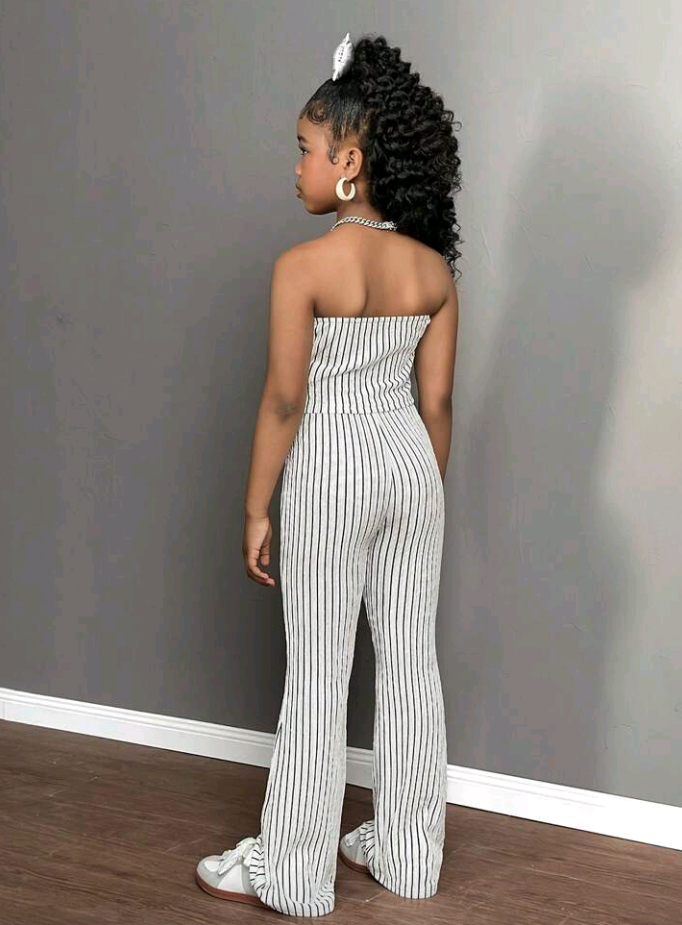 Tween Girl Summer Beach Texture Green Tube Top With Button & Flared Pants Set